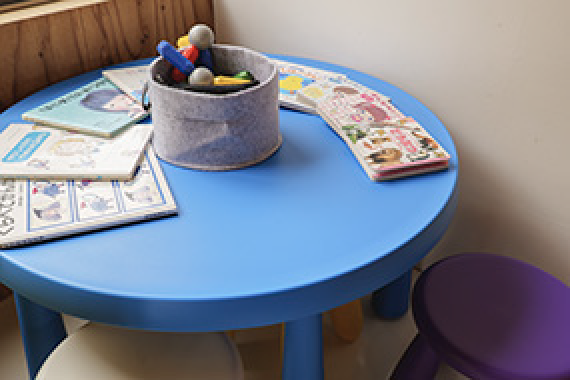 小さなお子さまが待っている間に遊べるキッズスペースを完備。楽しい絵本やおもちゃ、子ども用のイスとテーブルも配置しています。