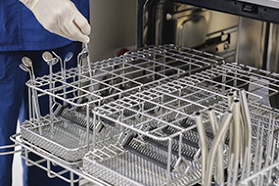 ドイツ製の高性能洗浄機で歯科用の器具を洗浄・消毒します。血液や唾液などのタンパク質が凝固しない55℃の温水で洗浄したのち、専用洗剤で全ての汚染を除去します。