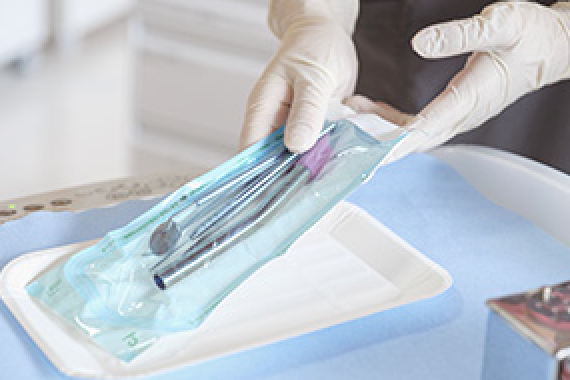 患者さまに使用する前の滅菌処理が施された医療機器等は、滅菌バッグにて個別に包装し、清潔な場所で保管しています。